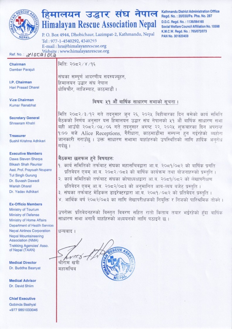 HRA Manang Aid-post, Pheriche Aid-post and HRA Everest-ER are successfully completed for 2025 Spring Season. HRA Aid-posts have been providing medical services to the trekkers, support staff, guides, porters and local people in the Annapurna and Khumbu region since its inception. Likewise, HRA Everest-ER Medical Camp has been providing medical facilities to the climbers and support staff since 2003.